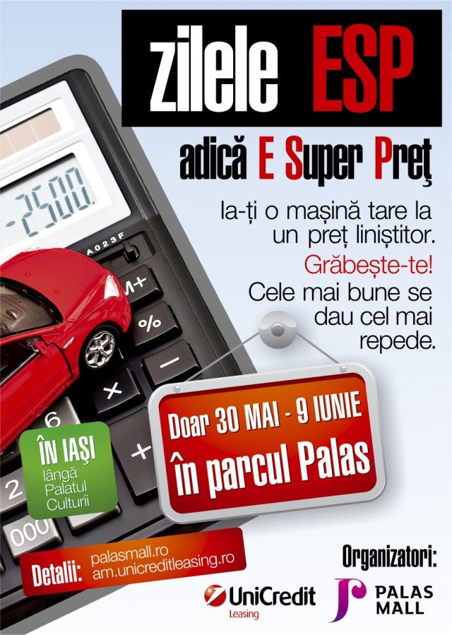 Ansamblul urbanistic Palas Iaşi şi UniCredit Leasing îi aşteaptă pe ieşeni şi pe clienţii din regiune să îşi aleagă automobilul mult dorit, în cadrul unei expoziţii cu vânzare de exemplare auto, cu preţuri reduse, începând de la 3.770 de euro. Ford Fiesta, Chevrolet Cruze, Dodge Nitro, Lexus RX 350, Porsche Cayenne şi BMV 550I sunt doar o parte dintre „bijuteriile” auto care vor putea fi testate şi cumpărate la oferte avantajoase, valabile doar la Palas, în perioada 30 mai – 9 iunie 2013. Evenimentul „Zilele ESP”, adică „E Super Preţ!”, se desfăşoară în piaţeta centrală din Parcul Palas. ”UniCredit Leasing a făcut o selecţie din parcul său cu maşini provenite din contracte de leasing financiar sau operaţional şi va prezenta publicului 18 autoturisme diverse, printre care compacte, business, de familie, utilitare, SUV-uri şi chiar unul cu rol de magazin mobil. Toţi iubitorii de automobile care vor vizita expoziţia din grădina publică Palas vor beneficia de un discount de 5% faţă de preţurile de listă,pentru contractele încheiate doar pe durata evenimentului. Clienţii Palas care doresc să cumpere o altă maşină din cele peste 2.000 de autoturisme de pe site-ul Am.Unicreditleasing.Ro, beneficiază, de asemenea, de reducerea de 5%, însă doar până pe 9 iunie”, se precizează într-un comunicat al departamentului PR al Iulius Group. Automobilele expuse vor fi disponibile pentru sesiuni de drive-test, iar agenţii leasing UniCredit vor oferi informaţii despre întregul parc auto. În plus, pe lângă discountul preferenţial de 5%, organizatorii mai oferă un avantaj: posibilitatea plăţii prin leasing financiar, leasing operaţional sau credit auto. (E.M.)