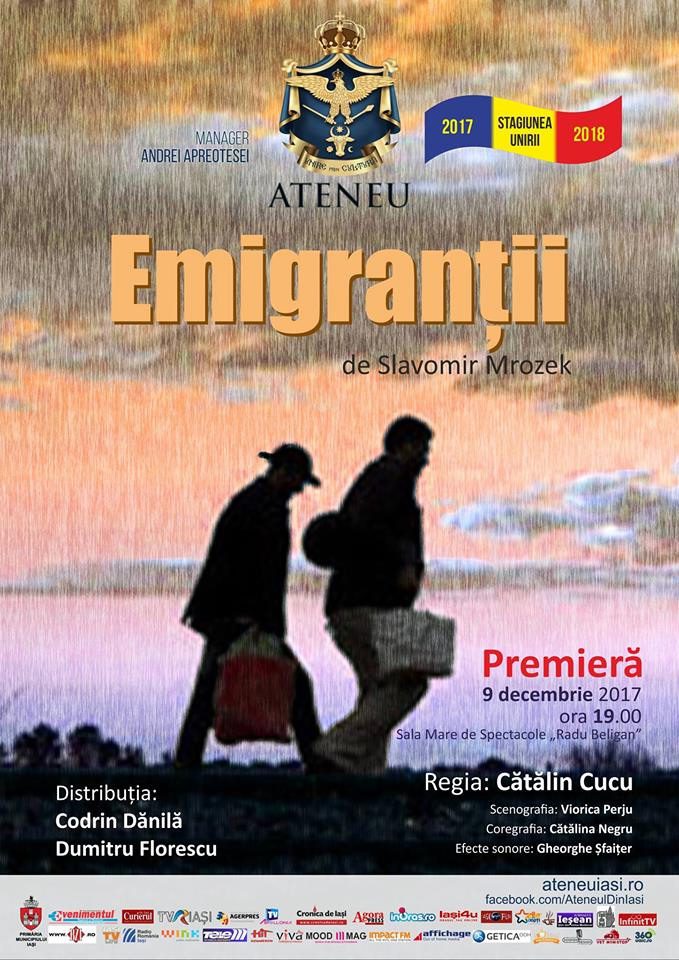 Conducerea Ateneului Tătăraşi pregăteşte ieşenilor o nouă premieră: „Emigranții”, o comedie după piesa scrisă de Slavomir Mrozek, în regia lui Cătălin Cucu. Aceasta va avea loc sâmbătă, 9 decembrie, la ora 19.00, în Sala Mare de spectacole „Radu Beligan” de la Ateneu. Prețul biletelor este de 20 de lei/ 15 lei cu reducere. „Piesa este o lungă conversație între doi oameni diferiți, doi oameni care fac parte din clase sociale diferite. Doi oameni între care există o permanență confruntare cu o tentativă de omucidere și una de sinucidere, ambele eșuând în grotesc. Toată piesa este un studiu psihologic asupra condiției de exilat. Într-un subsol obscur, doi colegi de apartament, emigrantul politic „AA” și emigrantul economic „XX” discută între ei. Primul visează la ziua în care va scrie opera vieții sale, în timp ce al doilea agonisește bani, visând ca într-o bună zi se va întoarce în satul natal unde își va construi o casă. Dialogul lor, la început banal, începe să ia o forma unui duel în care pas cu pas „AA”și „XX” se demască reciproc. Inteligentul „AA” dezaprobă iluziile naive ale lui „XX” relevându-i prostia. La rândul său, emigrantul „XX” descoperă secretul inteligentului „AA”, ipocrizia și pseudo-intelectualismul care-i mascau singurătatea. Aceste două personaje par să contrasteze puternic, comunicarea dintre ei pare imposibilă, dar, de fapt unul nu poate exista fără celălalt. Ei sunt întruparea contradicțiilor. Nici unul nu este complet bun sau complet rău. Împreună ei alcătuiesc tipologiile a mii de emigranți ce se află azi în Europa, emigranți ce devin sclavii propriilor vise”. Cătălin Cucu, regizor. În distribuţie: Dumitru Florescu – emigrantul economic „XX” şi Codrin Dănilă – emigrantul politic „AA”. Biletele au fost puse în vânzare la următoarele prețuri: 20 lei/ 15 lei pentru elevi, studenți, pensionari, șomeri, și pot fi achiziționate on-line de pe site-ul www.ateneuiasi.ro sau direct de la casieria Ateneului de luni până vineri în intervalul orar 10.00 -16.30 sau cu o oră înaintea începerii spectacolului.