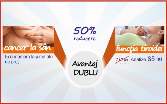 În cadrul campaniei “Avantaj Dublu” fiecare pacient poate beneficia, în 8 judeţe din ţară, de reducere 50% la pachetul de screening la care se adaugă 25% reducere pentru orice investigaţie suplimentară recomandată de medic. Pentru monitorizarea cancerului la sân se oferă ecografie mamară la jumătate de preţ, iar pentru afecţiunile tiroidiene, pachetul cuprinde analize medicale dedicate la doar 65lei.