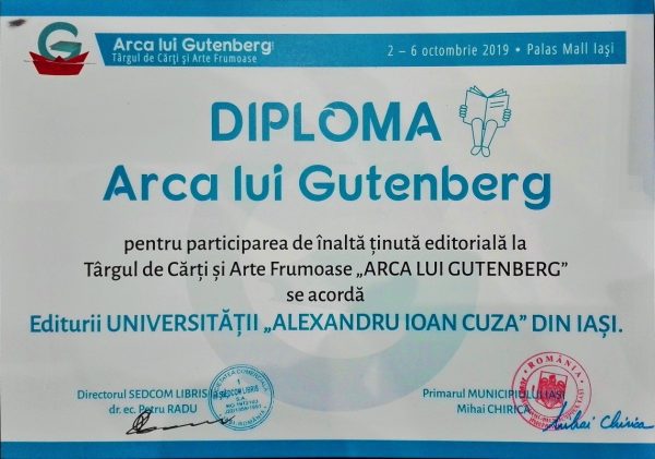 Sâmbătă, 5 octombrie 2019, în cadrul ceremoniei de decernare a diplomelor Târgului de Cărţi şi Arte Frumoase „Arca lui Gutenberg”, Editura Universităţii „Alexandru Ioan Cuza” din Iași a primit Diploma „Dimitrie Cantemir” pentru cartea universitară și academică.
