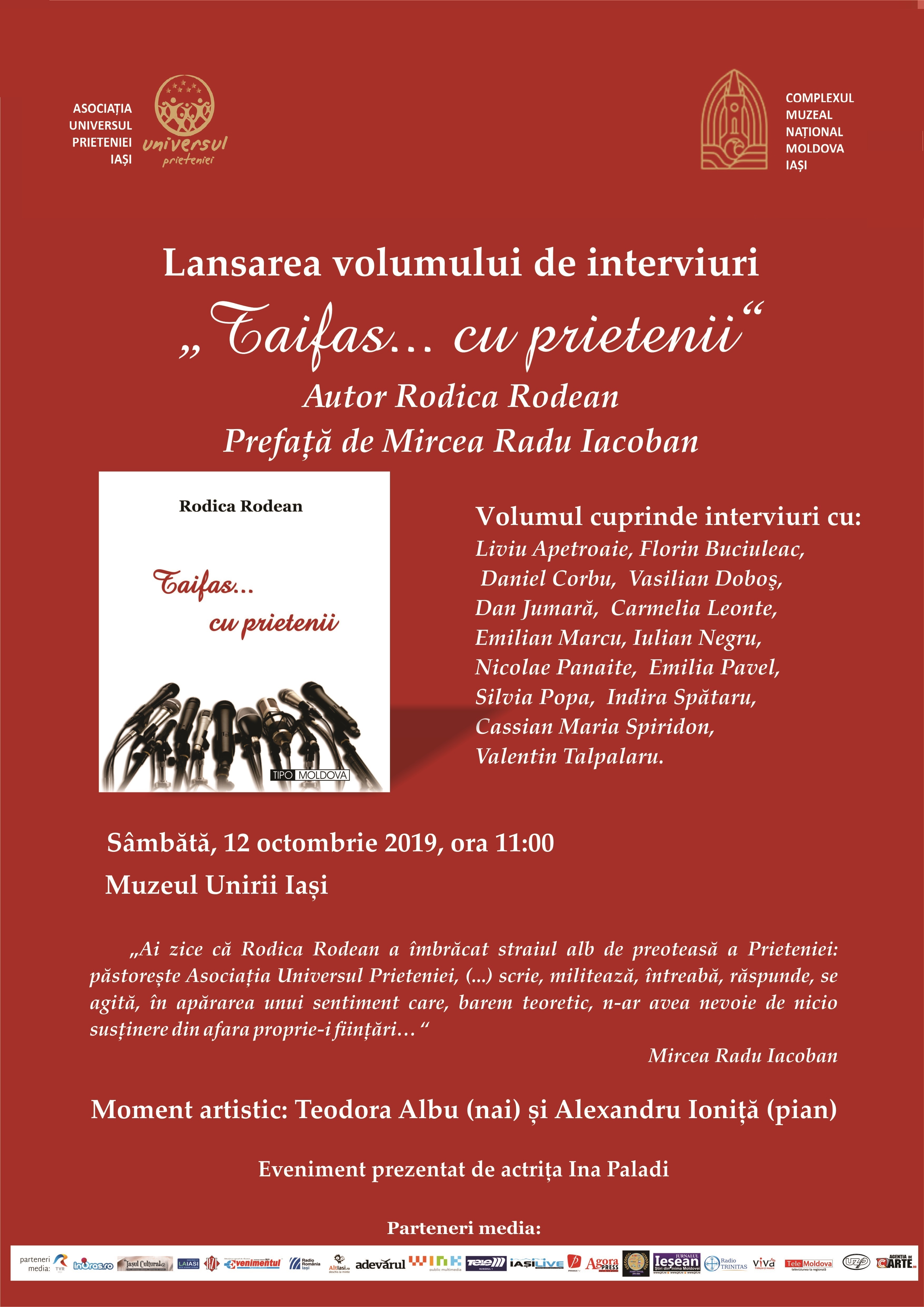 Complexul Muzeal Naţional „Moldova” Iaşi și Asociația „Universul Prieteniei” Iași organizează sâmbătă, 12 octombrie, de la ora 11.00, la Muzeul Unirii, evenimentul de lansare a volumului de interviuri „Taifas… cu prietenii”, semnat de Rodica Rodean. Volumul, apărut la Editura „TipoMoldova” Iași, cuprinde interviuri cu Liviu Apetroaie, Florin Buciuleac, Daniel Corbu, Vasilian Doboş, Dan Jumară, Carmelia Leonte, Emilian Marcu, Iulian Negru, Nicolae Panaite, Emilia Pavel, Silvia Popa, Indira Spătaru, Cassian Maria Spiridon, Valentin Talpalaru. „Ai zice că Rodica Rodean a îmbrăcat straiul alb de preoteasă a Prieteniei: păstorește Asociația Universul Prieteniei, (…) scrie, militează, întreabă, răspunde, se agită, în apărarea unui sentiment care, barem teoretic, n-ar avea nevoie de nicio susținere din afara proprie-i ființări…”, scrie Mircea Radu Iacoban, în prefața acestui volum. Evenimentul va fi prezentat de actriţa Ina Paladi și completat de recitalurile susţinute de Teodora Albu (nai) şi Alexandru Ioniţă (pian). (E.M.)