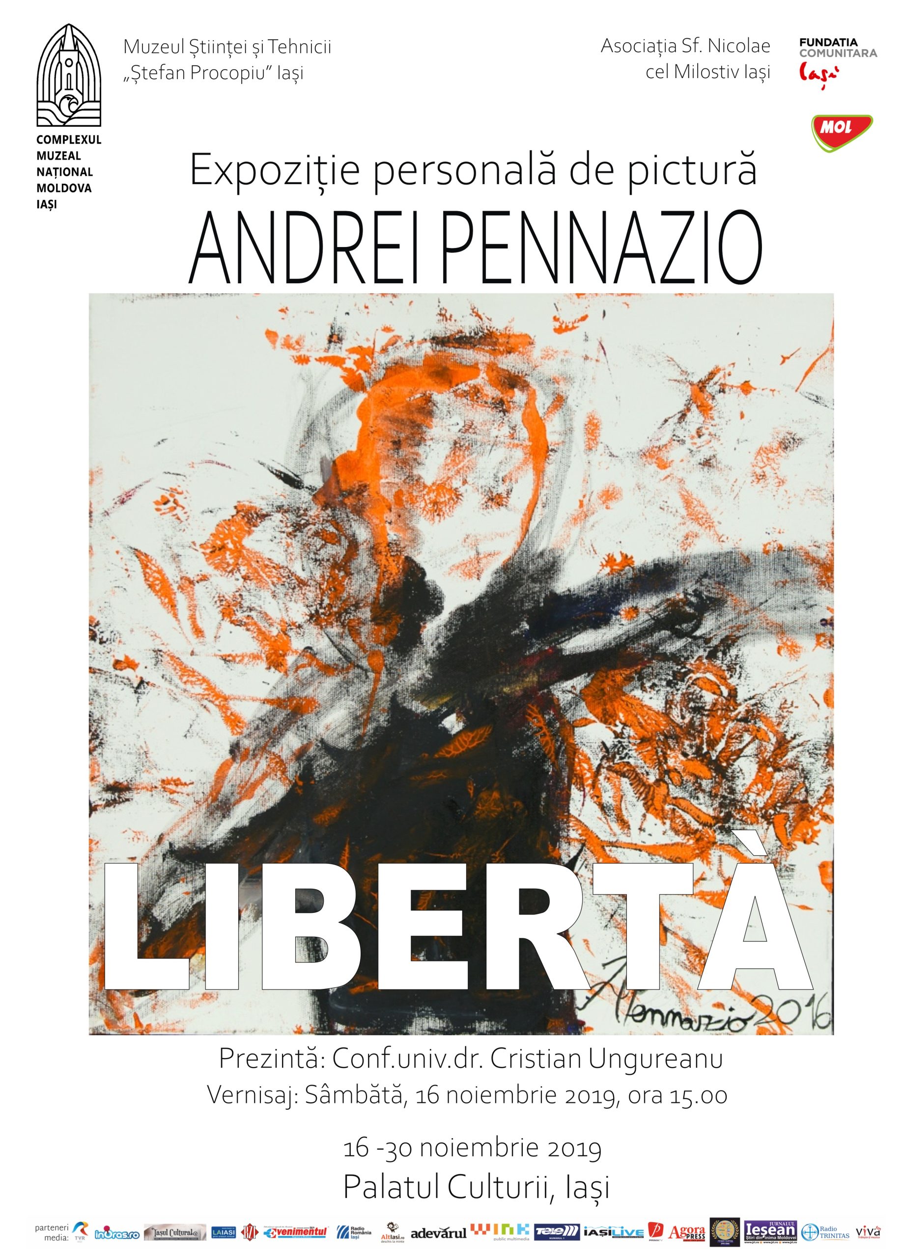 Complexul Muzeal Național „Moldova” Iași – Muzeul Științei și Tehnicii „Ștefan Procopiu”, în parteneriat cu Asociația Sf. Nicolae cel Milostiv Iași, Fundația Comunitară Iași și MOL Iaşi organizează în perioada 16 – 30 noiembrie, la Palatul Culturii, expoziția de pictură a tânărului artist Andrei Pennazio, intitulată LIBERTÀ. Expoziția va fi prezentată de conf. univ. dr. Cristian Ungureanu, de la Universitatea Națională de Arte „George Enescuˮ din Iaşi. „Pictura lui Andrei Pennazio, poate şi merită să fie receptată ca o expresie a sensului înalt al libertăţii/libertà de a contempla complexitatea şi frumuseţea existenţei, pe care tânărul artist italian şi român, în egală măsură, o proiectează în compoziţiile sale, cel mai adesea cvasi-abstracte, dar păstrătoare ale unui limbaj simbolic ingenuu şi complex, în ceea ce priveşte integrarea în ţesutul compoziţional, cromatic şi expresiv al pânzelor saleˮ, spune conf. univ. dr. Cristian Ungureanu. Vernisajul expoziției va avea loc sâmbătă, 16 noiembrie, la ora 15.00, la Palatul Culturii. (E.M.)