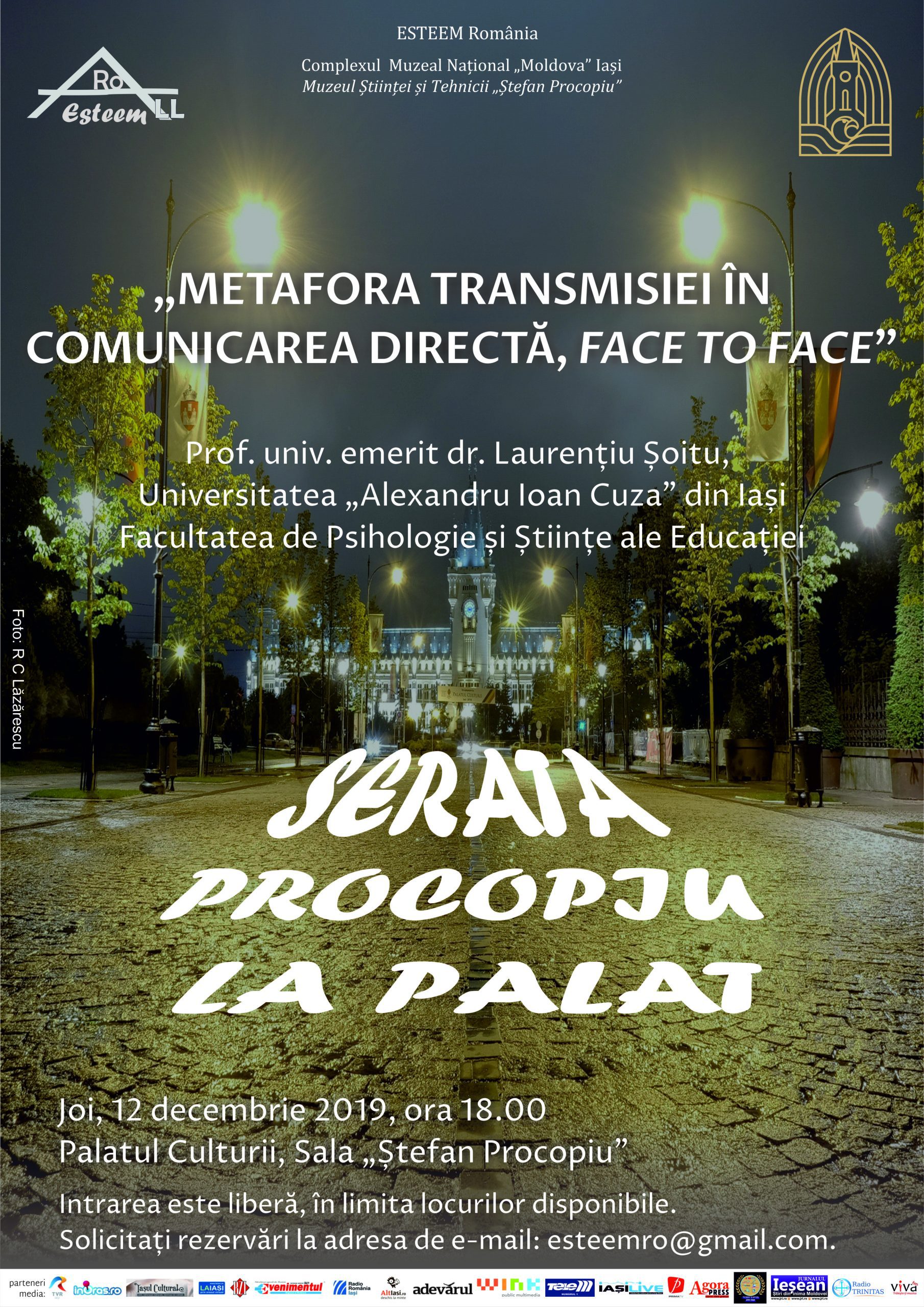 Complexul Muzeal Național „Moldova” Iași – Muzeul Științei și Tehnicii „Ștefan Procopiu” și Asociația „Aliance of Educators for Science, Technology, Engineering, Mathematics and Informatics” – ESTEEM organizează joi, 12 decembrie, de la ora 18.00, o nouă ediţie a Seratei „Procopiu” la Palat, cu tema „Metafora transmisiei în comunicarea directă, face to face”. Gazda evenimentului va fi Laurențiu Șoitu, profesor universitar emerit doctor al Universității „Alexandru Ioan Cuza” din Iași, de la Departamentul de Ştiinţe ale Educaţiei, Facultatea de Psihologie și Științe ale Educației. Personalitate marcantă a culturii ieșene, doctor în Filosofie și doctor în Știinţe ale Educației, specialist în Logică și Pedagogia comunicării, Laurenţiu Şoitu este primul român primit în International Adult and Continuing Education Hall of Fame, Oklahoma, USA, clasa 2008. Inițiator și coordonator, împreună cu dr. Mihaela Manta, al primelor Cabinete de Consiliere Psihopedagogică din România, este expert în comunicare educațională și în utilizarea noilor tehnologii și mass-mediei în educație prin crearea primei platforme de cercetare ştiinţifică interdisciplinară în domeniu – MEDIAEC şi a primei platforme de utilizare a manualului şi auxiliarelor digitale – EduPrim. Gazda seratei va introduce publicul în domeniul fascinant al comunicării directe, „face to face”. Redactor de emisiuni radio-TV, membru al Uniunii Ziariştilor Profesionişti, cercetător și profesor universitar cu rezultate recunoscute, expert al Consiliului Naţional al Audiovizualului, fondator de centre şi noi direcţii de cercetare și asociații profesionale, Laurențiu Șoitu intră, cu acest prilej, în galeria personalităților care au fost gazde ale Seratelor de la Palat: profesori și pedagogi, oameni de știință, cercetători de renume internațional, din țară și străinătate. Proiectul, lansat în martie 2017, din dorința de a insufla tinerei generații interesul pentru știință, este coordonat de prof. univ. dr. Ovidiu Florin Călțun, președinte ESTEEM România, în colaborare cu Monica Nănescu și Camelia Teodora Cristofor, de la Muzeul Științei și Tehnicii „Ștefan Procopiu”. Intrarea publicului la eveniment este liberă. (E.M.)