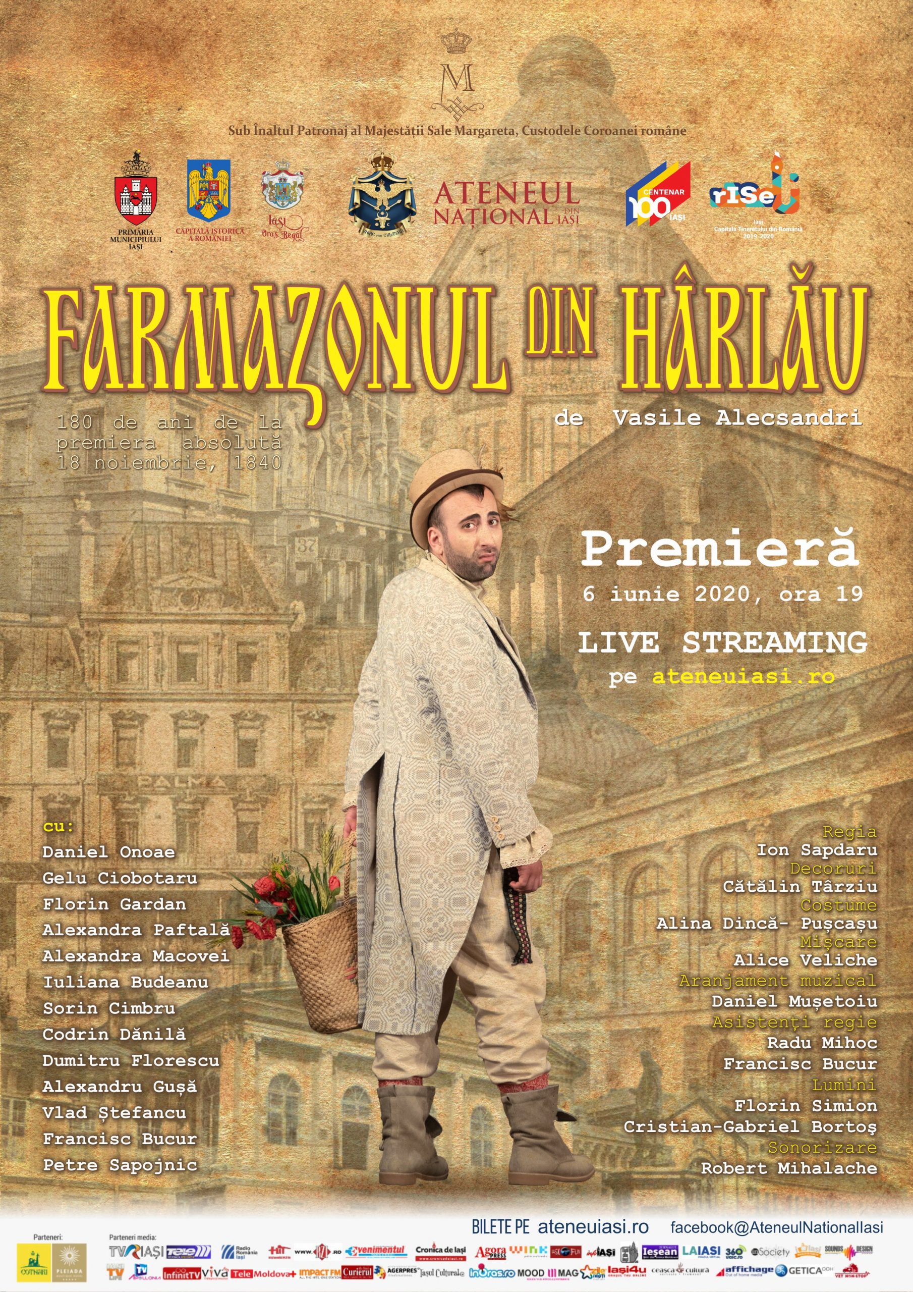 Sâmbătă, 6 iunie 2020, de la ora 19.00, Ateneul Național din Iași va difuza online premiera spectacolului „Farmazonul din Hârlău”, în regia lui Ion Sapdaru. În anul în care se împlinesc 180 de ani de la scrierea și montarea piesei, actorii Ateneului din Iași au pus în scenă, într-o variantă originală, prima operă dramatică a lui Vasile Alecsandri. Comedia în trei acte a avut premiera în noiembrie 1840, iar regia i-a aparținut lui Costache Caragiale, unchiul lui Ion Luca Caragiale. Spectacolul prezintă un tânăr aspirant din Hârlău pe nume Pestriţ, care vine la Iași și nimereşte pe mâna unor boiernaşi dornici de distracţie şi de petreceri pe gratis. Deliciul piesei este reprezentat de cele două dorințe ale lui Pestriț: să se însoare şi să facă parte din societatea farmazonilor. Pentru a împiedica logodna lui Pestriţ, aceşti mici escroci de la Iaşi se dau drept o societate francmasonă şi se obligă să-l primească pe Pestriţ în rândurile lor. Comedia capătă valenţe groteşti prin felul cum îşi închipuie bonjuriștii ceremonia de primire în loja masonică. Ceremonia de inițiere se desfăşoară într-o pivniţă, iar naivul Pestriţ este supus la aşa zisele încercări ale lojei, este pălmuit și se întâlneşte pe tărâmul morţii cu alţi pretendenţi la loja masonică, care rătăcesc de săptămâni întregi şi nu își găsesc salvarea. Într-un final, Pestriţ îşi pierde drepturile de logodnic şi află că, de fapt, i s-a făcut o farsă şi nu este nici farmazon. Îndurerat, Pestriţ se întoarce acasă, la Hârlău. Spectacolul va fi difuzat în regim de live streaming și va fi disponibil spre vizionare pe site-ul instituției, pe 6 iunie 2020, în intervalul 19:00-23:59. Acesta va putea fi urmărit pe o durată de 4 ore de la începerea vizionării. Din distribuție fac parte: Daniel Onoae (Pestriț), Gelu Ciobotaru (Titirez), Florin Gardan (Leonil), Alexandra Paftală (Aglăița), Alexandra Macovei (Zizi), Iuliana Budeanu (Garofa), Sorin Cimbru (Slugerul Gânganu), Codrin Dănilă (Frantz Macson), Dumitru Florescu (Comisarul), Alexandru Gușă (Trântescu), Vlad Ștefancu (Milescu), Francisc Bucur (Vasile) și Petre Sapojnic (Grigore). Biletele pot fi achiziționate de pe https://www.ateneuiasi.ro/class/farmazonul-din-harlau-regia-ion-sapdaru-live-streaming/.
