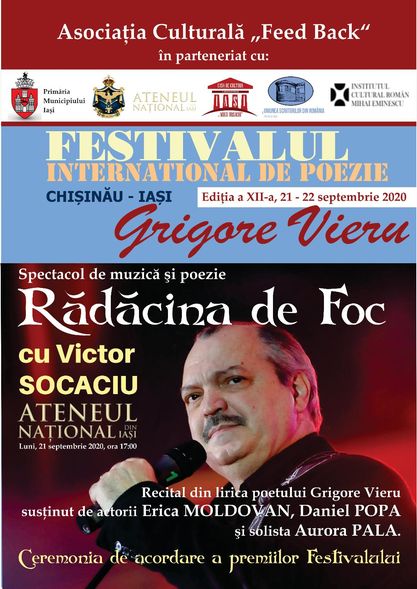 În organizarea ASOCIAȚIEI CULTURALE „FEED BACK”, în parteneriat cu PRIMĂRIA MUNICIPIULUI IAȘI, Ateneul Național din Iași, Consulatul General al Republicii Moldova la Iași, Institutul Cultural Român „Mihai Eminescu” din Chișinău, Casa de Cultură „Mihai Ursachi” a Municipiului Iași și Uniunea Scriitorilor din România – Filiala Iași, în zilele de 21 şi 22 septembrie, la Iaşi va avea loc cea de-a XII-a ediție a FESTIVALULUI INTERNAȚIONAL DE POEZIE „GRIGORE VIERU”. Potrivit organizatorilor, ţinând cont de situaţia provocată de pandemia de COVID-19, ediţia din acest an a manifestării va fi una specială, cu obligativitatea respectării de către participanţi a regulilor sanitare de protecţie împotriva virusului SARS-CoV-2. În programul festivalului sunt incluse, printre altele, recitaluri de muzică și poezie, sesiuni de conferințe, spectacole şi mult aşteptata gală a premiilor, cu mențiunea că la cele două spectacole, care vor avea loc la ATENEUL NAȚIONAL DIN IAȘI și la TEATRUL DE VARĂ PALAS, se va intra pe bază de invitații și în ordinea ajungerii la sală.