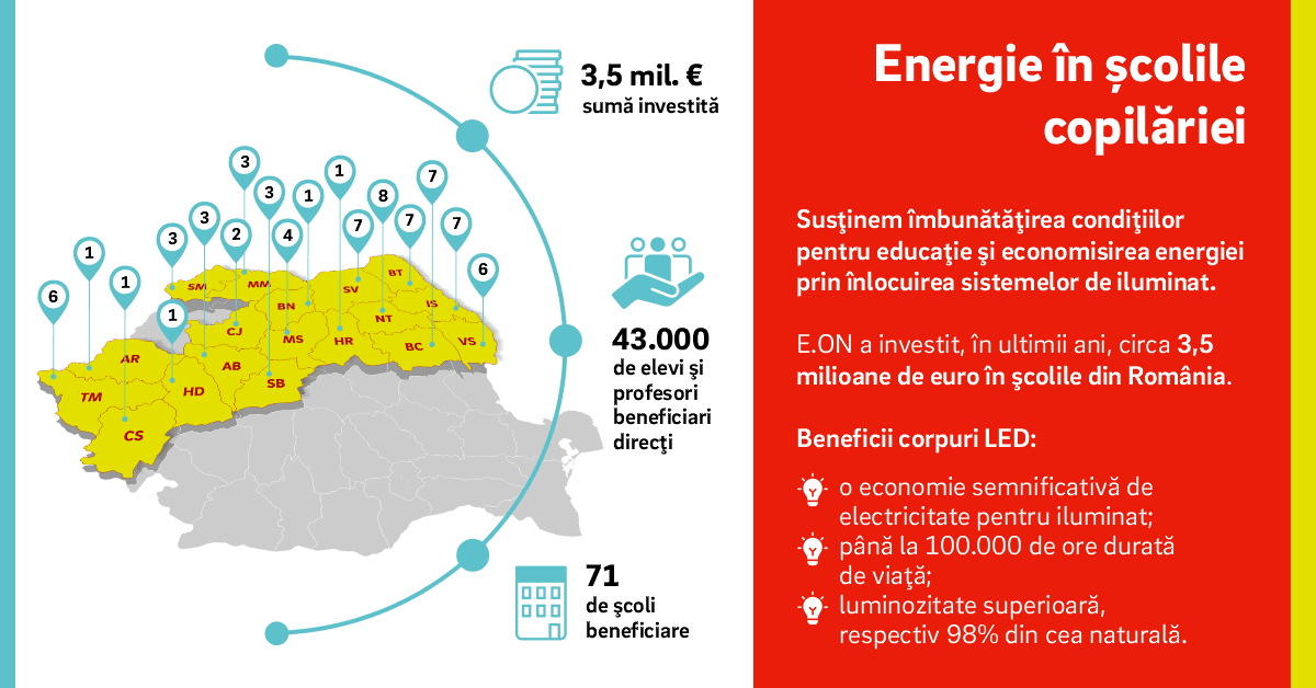 E.ON Energie România continuă să fie aproape de comunitățile locale prin intermediul proiectului „Energie în școlile copilăriei”, derulat începând cu anul 2012. În acest an, opt unități de învățământ din județele Iași, Bacău, Neamț, Suceava, Cluj, Timiș și Mureș vor avea condiții mai bune de studiu, urmare a înlocuirii sistemului de iluminat cu unul modern, bazat pe tehnologie led.