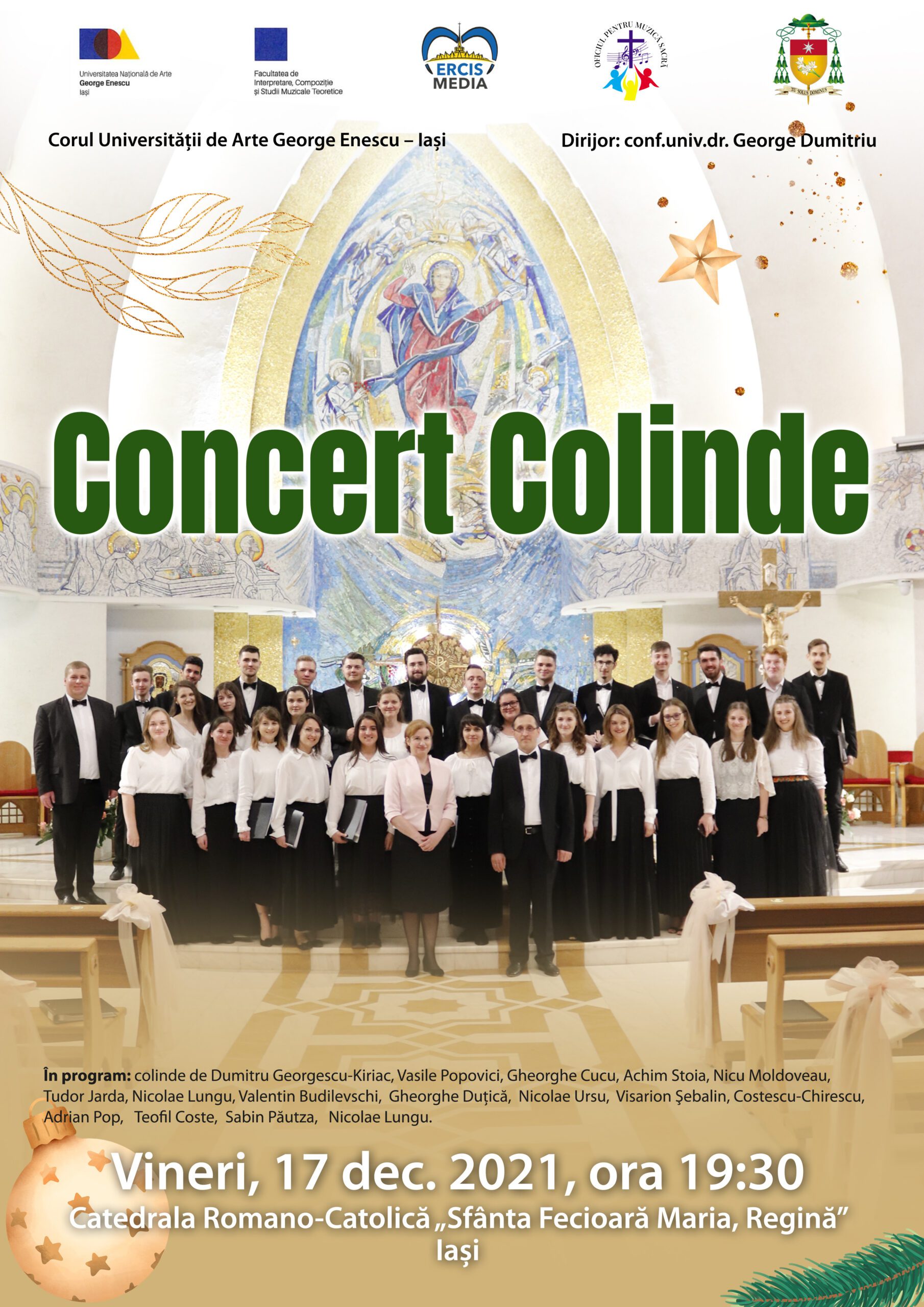 În prag de sărbători, Corul Universității Naționale de Arte “George Enescu” (UNAGE) invită ieșenii la îndătinatul Concert de Colinde, care va avea loc vineri,17 decembrie, de la ora 19:30,în Catedrala Romano-Catolică “Sfânta Fecioară Maria Regină”. Cu acest prilej, publicul va putea asculta lucrări de Dumitru Georgescu Kiriac, Gheorghe Cucu, Nicolae Lungu, Vasile Popovici, Nicolae Ursu, Tudor Jarda, Adrian Pop, Valentin Budilevschi, Gheorghe Duțică și alți compozitori contemporani. Dirijor: conf. univ. dr. George Dumitriu. Concertul va fi transmis online pe http://media.ercis.ro/iasicatedrala.html.