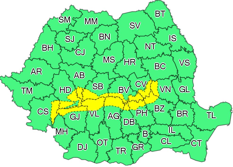 Judeţele vizate de atenţionarea Cod galben sunt: Vrancea, Buzău, Prahova, Dâmboviţa, Argeş, Vâlcea, Gorj, Caraş-Severin, Hunedoara, Alba, Sibiu, Braşov şi Covasna.