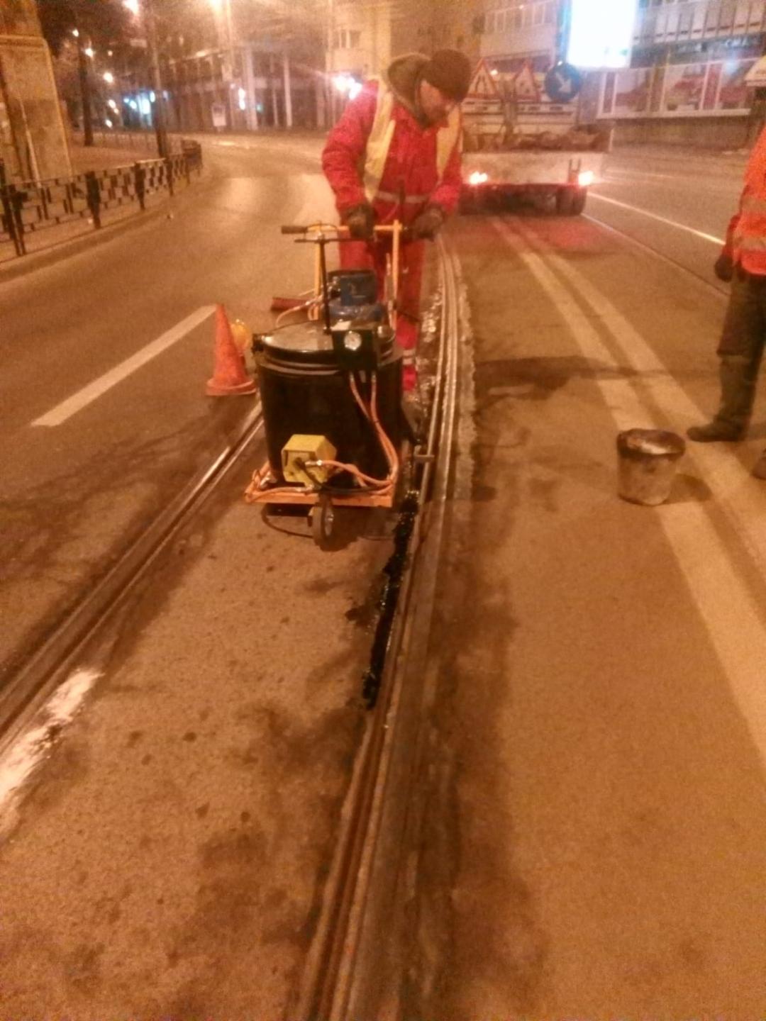 Echipele CTP lucrează la refacerea stratului de mastic la liniile de tramvai